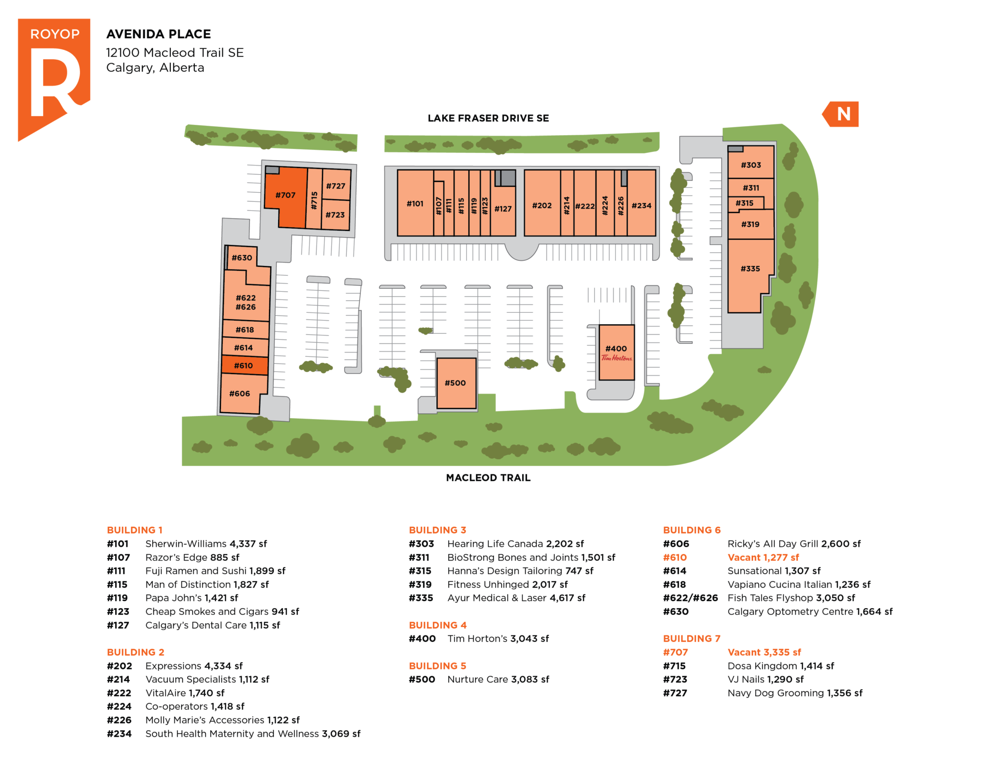The 97,000 square foot open-air shopping centre is within the regional shopping node for the communities of Bonavista, Lake Bonaventure, Canyon Meadows and Deer Ridge. The centre is competitively positioned along Macleod Trail South which provides exposure to over 112,000 vehicles per day. Avenida Place offers a mix of popular national and local brands including Tim Horton’s, Ricky’s All-Day Grill, Sherwin Williams Paints, Expressions Ladies Consignment, and South Health Maternity & Wellness.