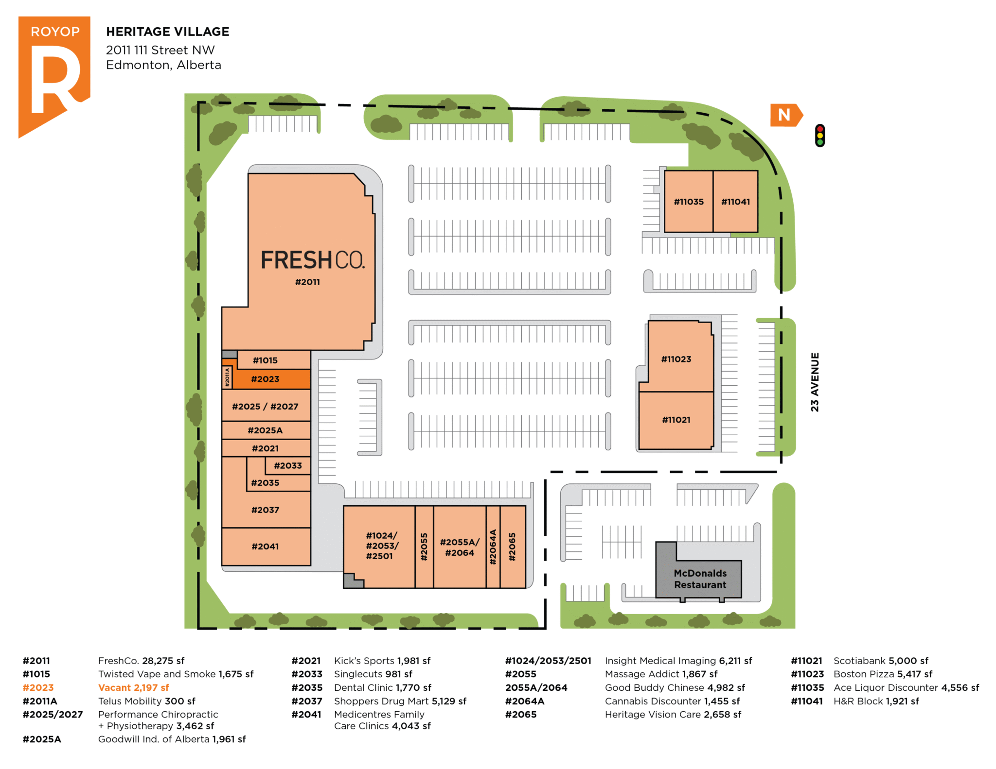 Well positioned on the corner of two high traffic streets (111 St and 23 Ave NW), Heritage Village Shopping Centre features over twenty tenants, including anchor, FreshCo and Scotiabank, Boston Pizza and Shoppers Drug Mart. Royop acquired Heritage Village October 2023.